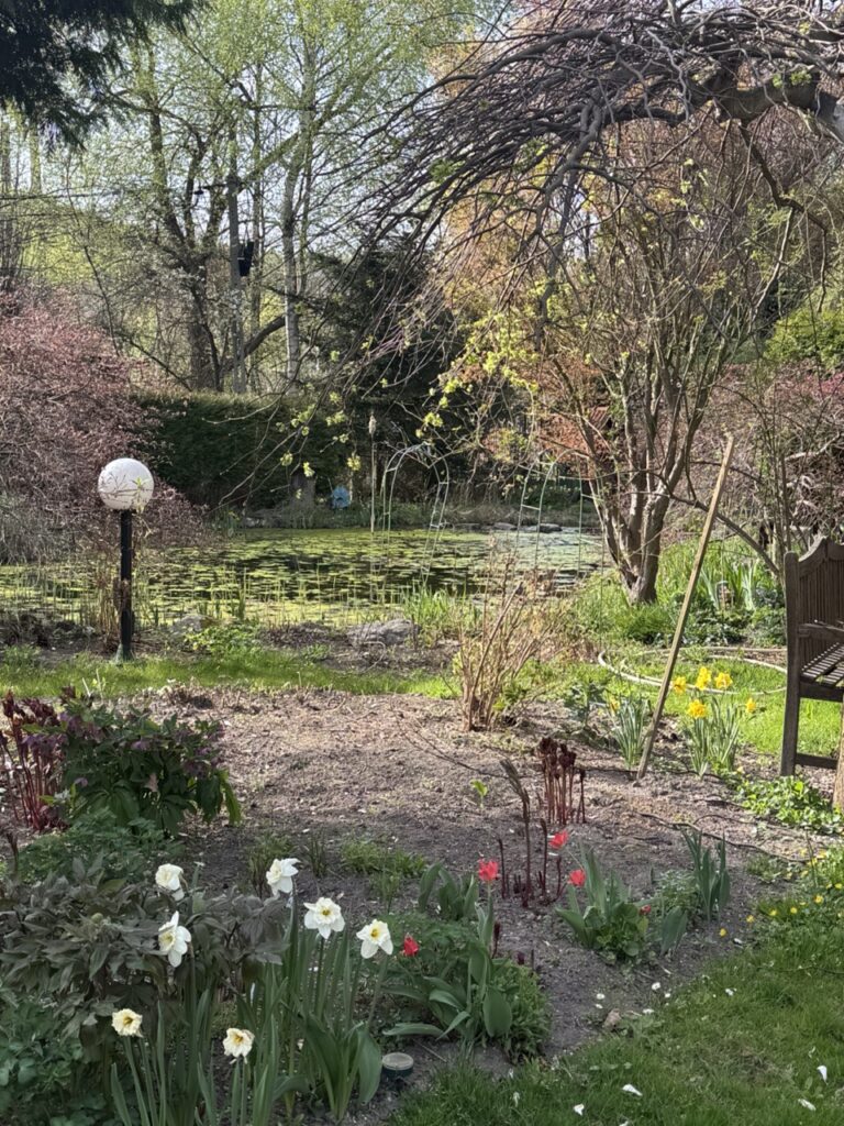 🌾 Zanurzysz się w ciszy nad stawem, który wygląda, jakby istniał tu od zawsze. Otoczony bujną roślinnością, z odbijającym się w tafli niebem i kaczkami, które zamieszkały w nim na dobre. To miejsce pełne spokoju – idealne, by na chwilę się zatrzymać, odetchnąć i posłuchać ogrodu.